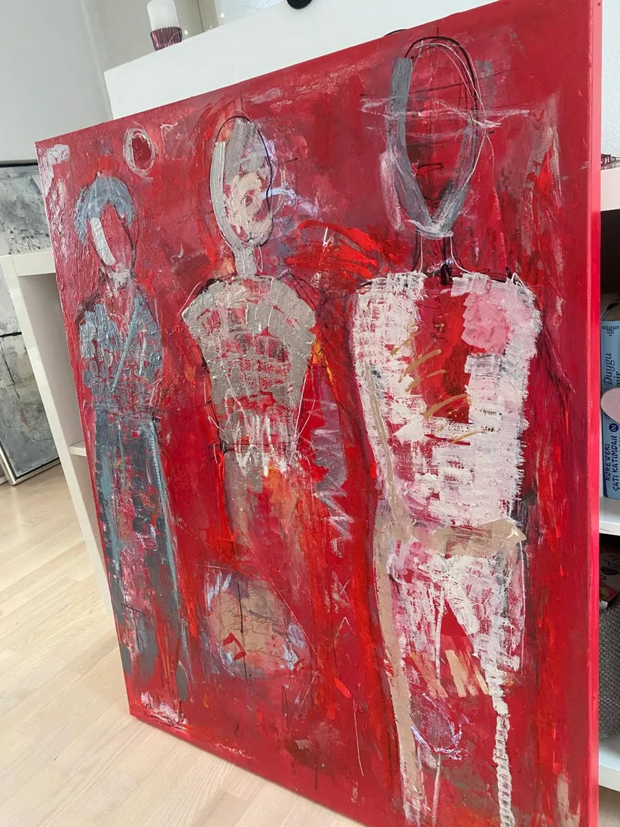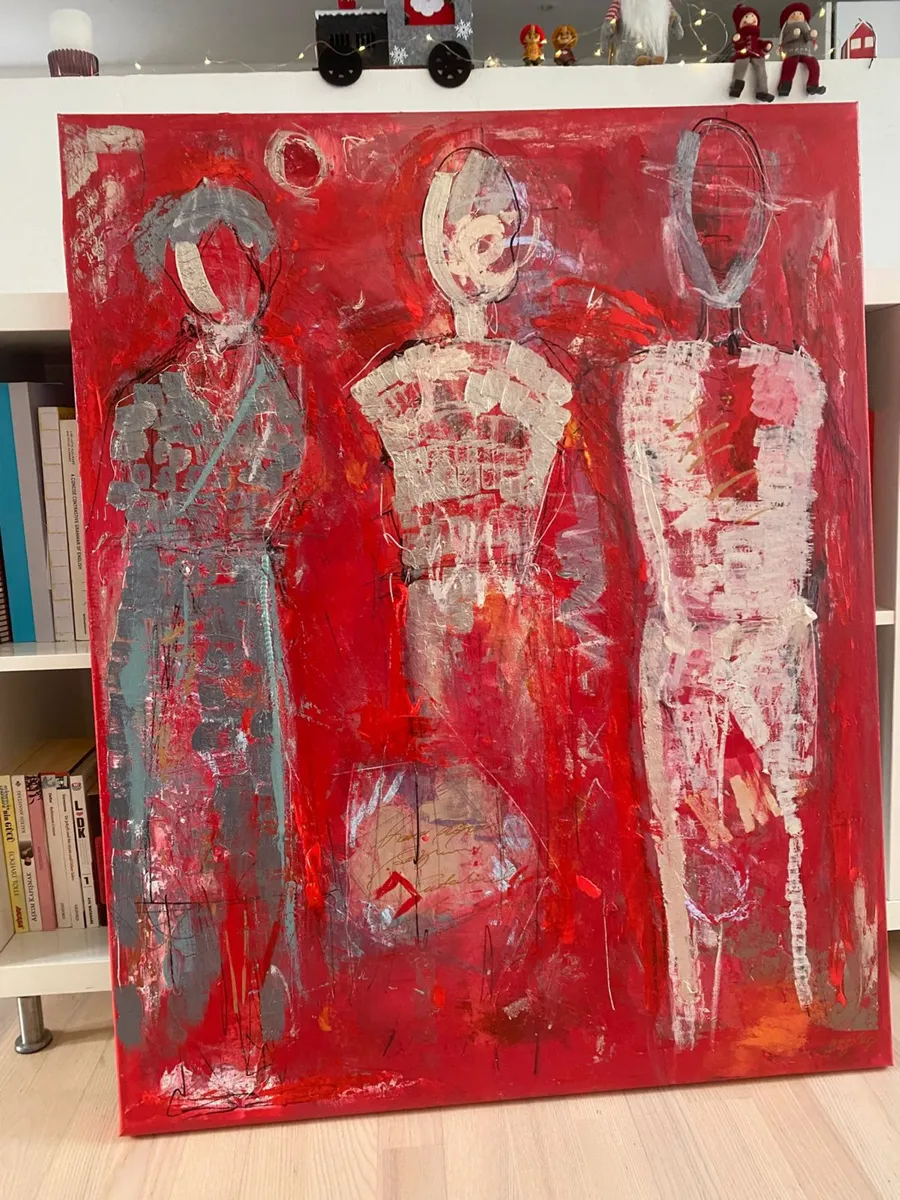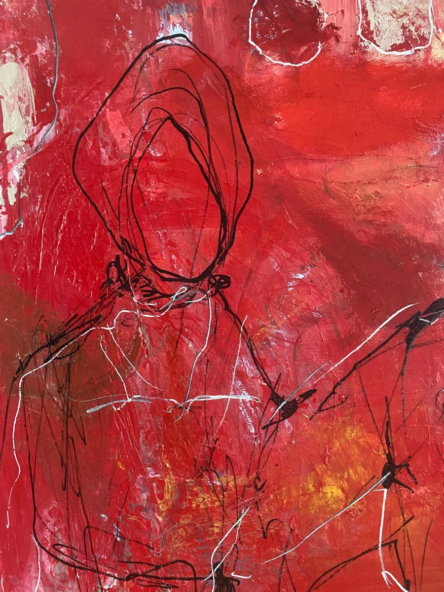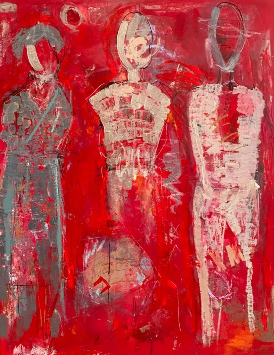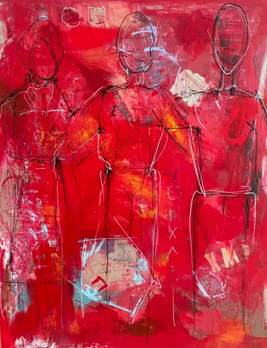 The Silent Witnesses I have been inspired by the idea of presence and absence. The three figures without faces or details represent the quiet observers in our lives, those who see everything but are not always seen themselves. By the red background I would liked to show the intensity and emotions of life, while the abstract elements reflect the chaos and complexity we all experience. My intention by this painting is to reminds us to notice and appreciate the silent observers who, even without being acknowledged, shape our world and our experiences. By recognizing them, we understand more about the human condition and how we are all connected.