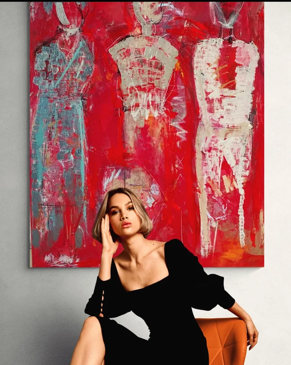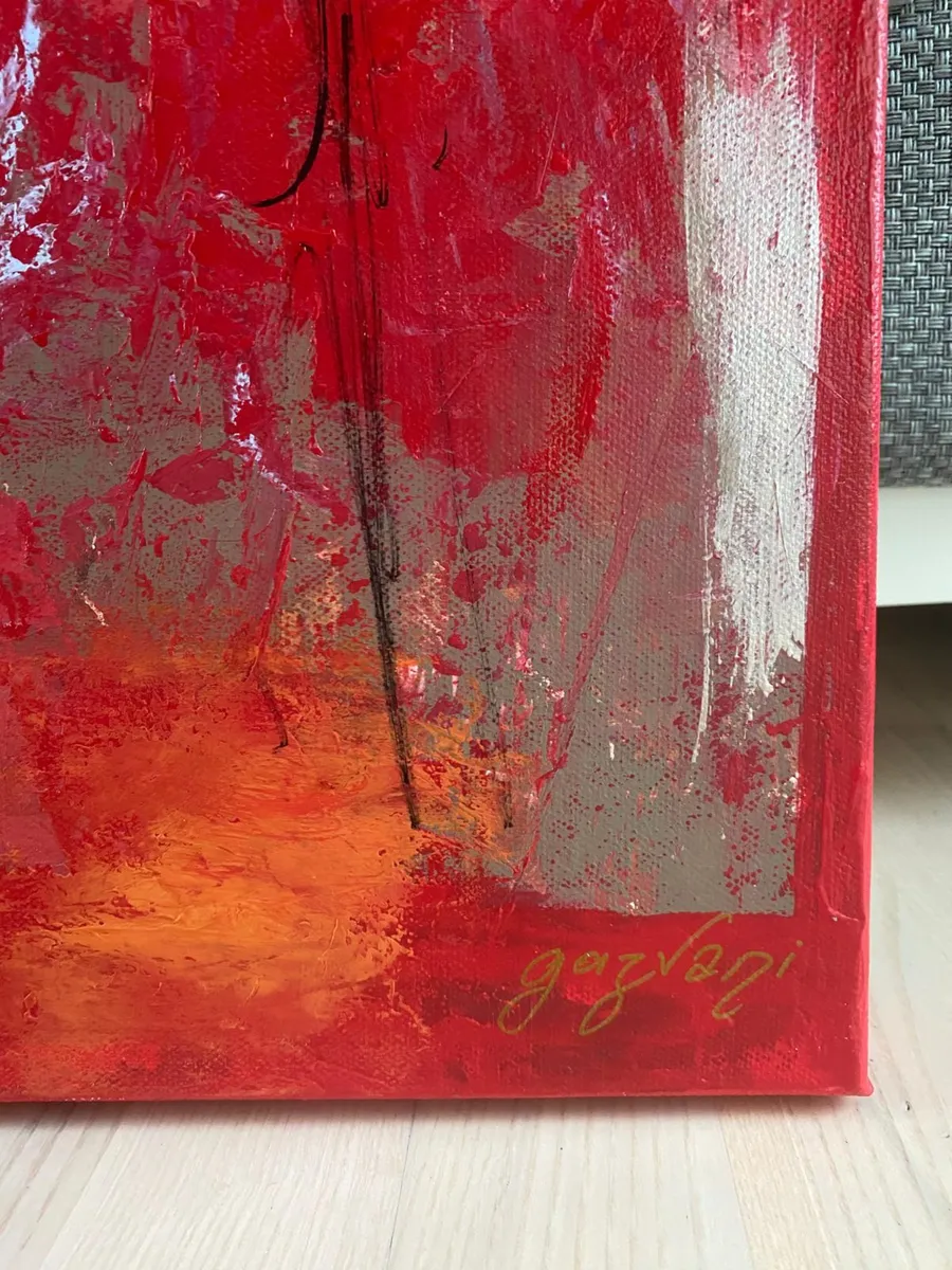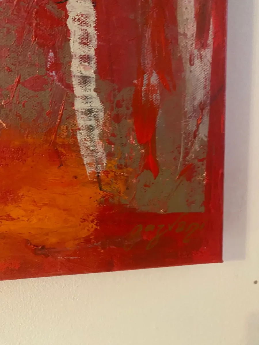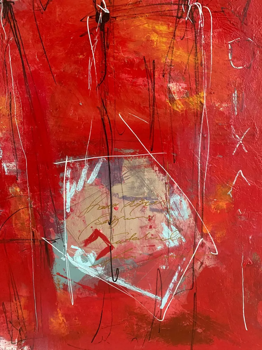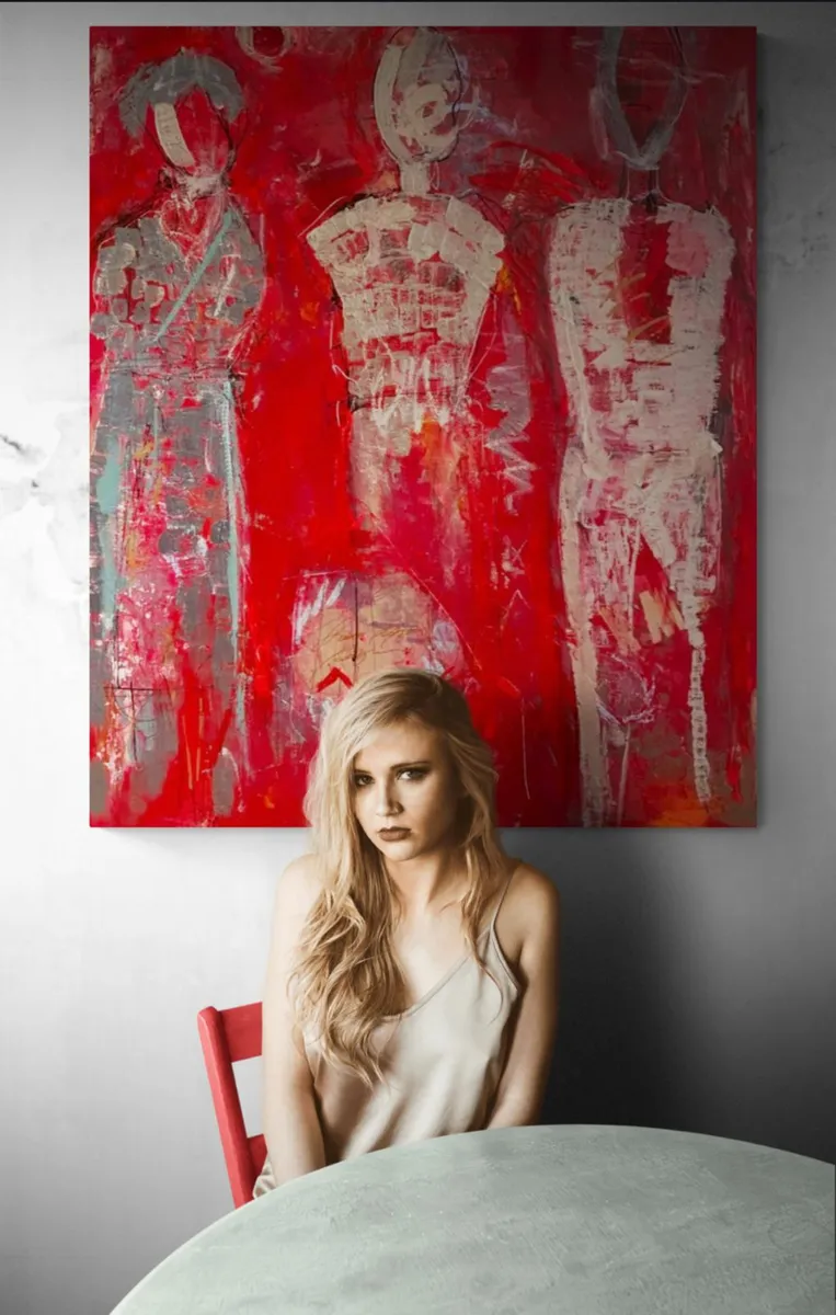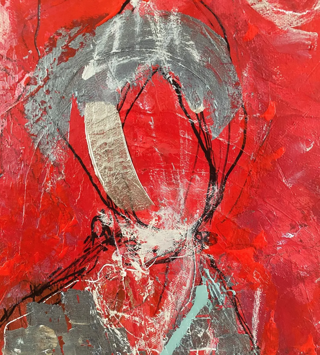 The Silent Witnesses I have been inspired by the idea of presence and absence. The three figures without faces or details represent the quiet observers in our lives, those who see everything but are not always seen themselves. By the red background I would liked to show the intensity and emotions of life, while the abstract elements reflect the chaos and complexity we all experience. My intention by this painting is to reminds us to notice and appreciate the silent observers who, even without being acknowledged, shape our world and our experiences. By recognizing them, we understand more about the human condition and how we are all connected.