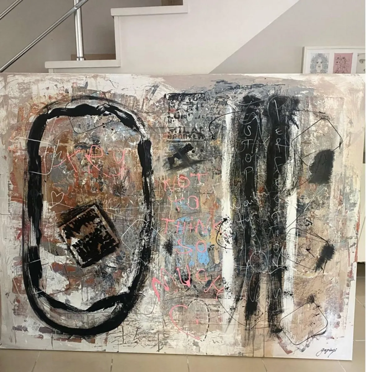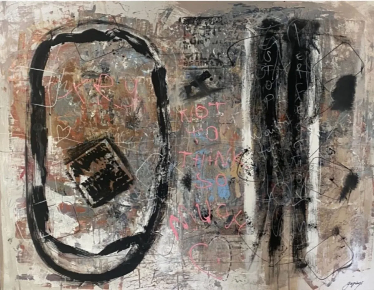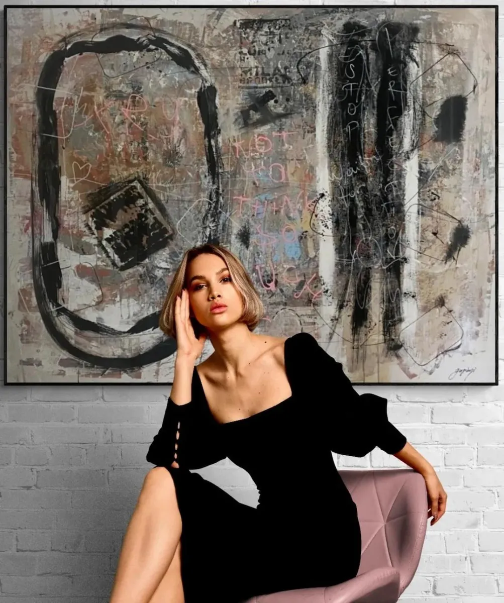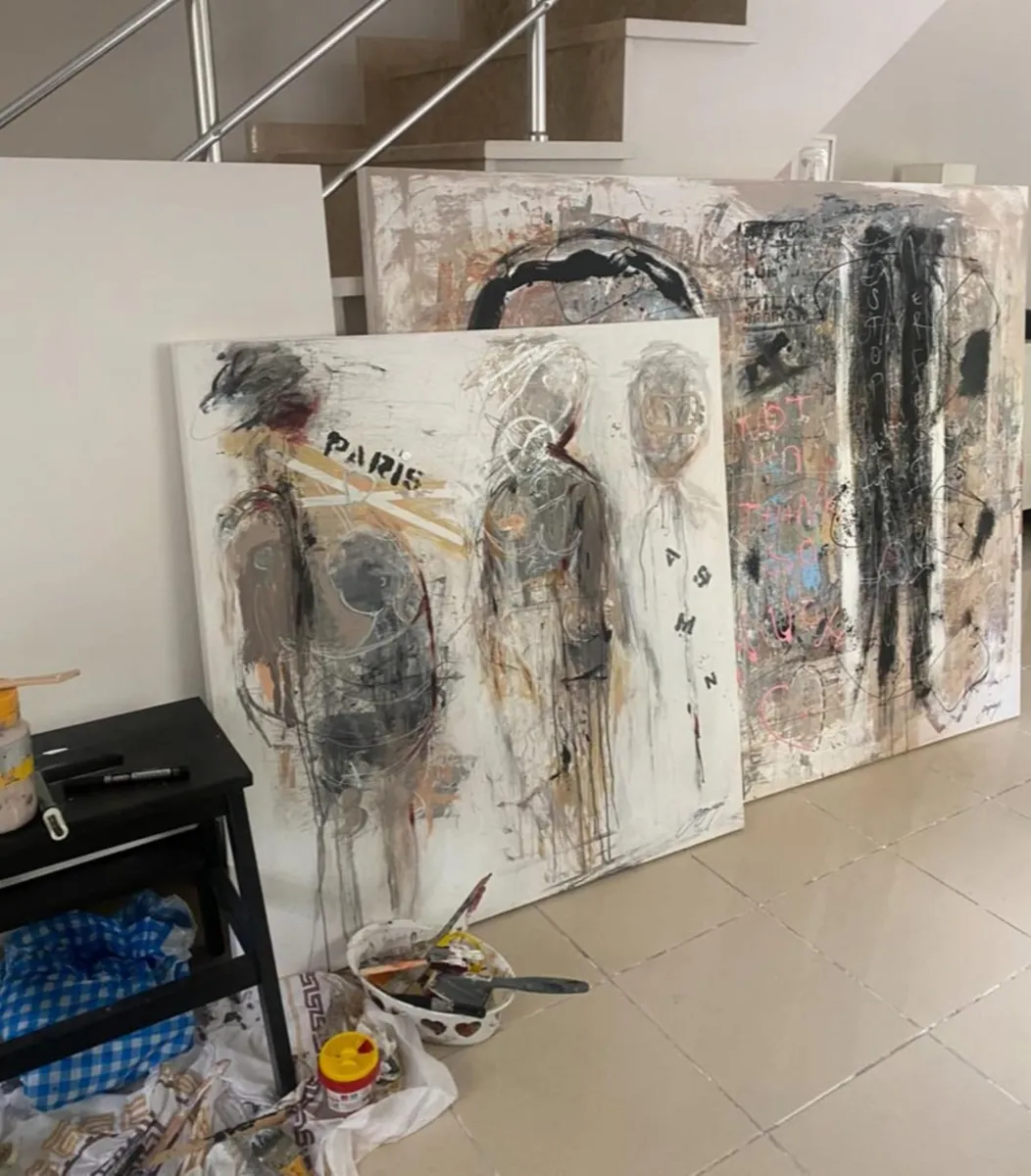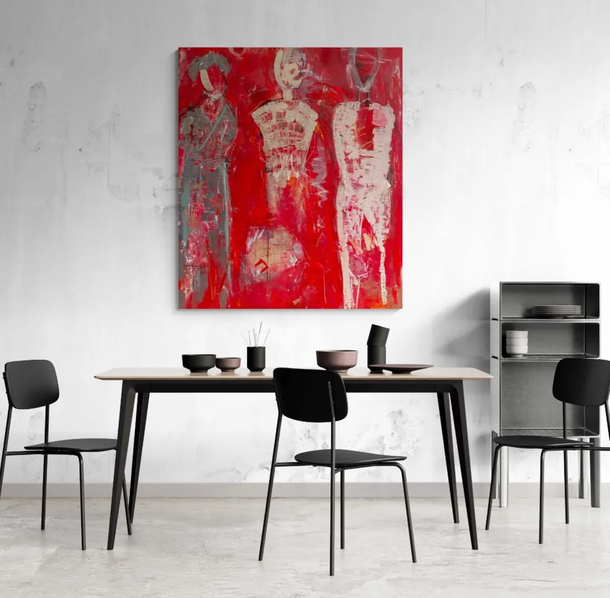 The Silent Witnesses I have been inspired by the idea of presence and absence. The three figures without faces or details represent the quiet observers in our lives, those who see everything but are not always seen themselves. By the red background I would liked to show the intensity and emotions of life, while the abstract elements reflect the chaos and complexity we all experience. My intention by this painting is to reminds us to notice and appreciate the silent observers who, even without being acknowledged, shape our world and our experiences. By recognizing them, we understand more about the human condition and how we are all connected.