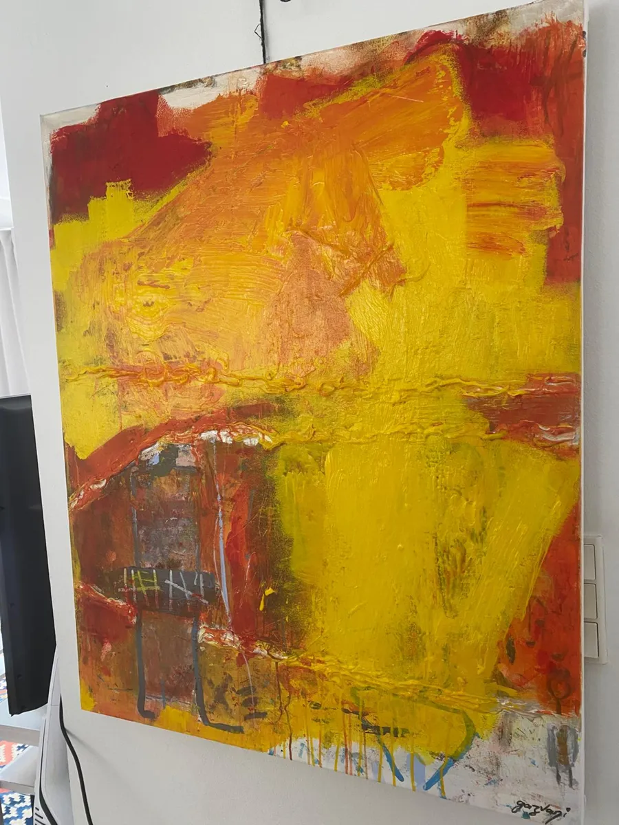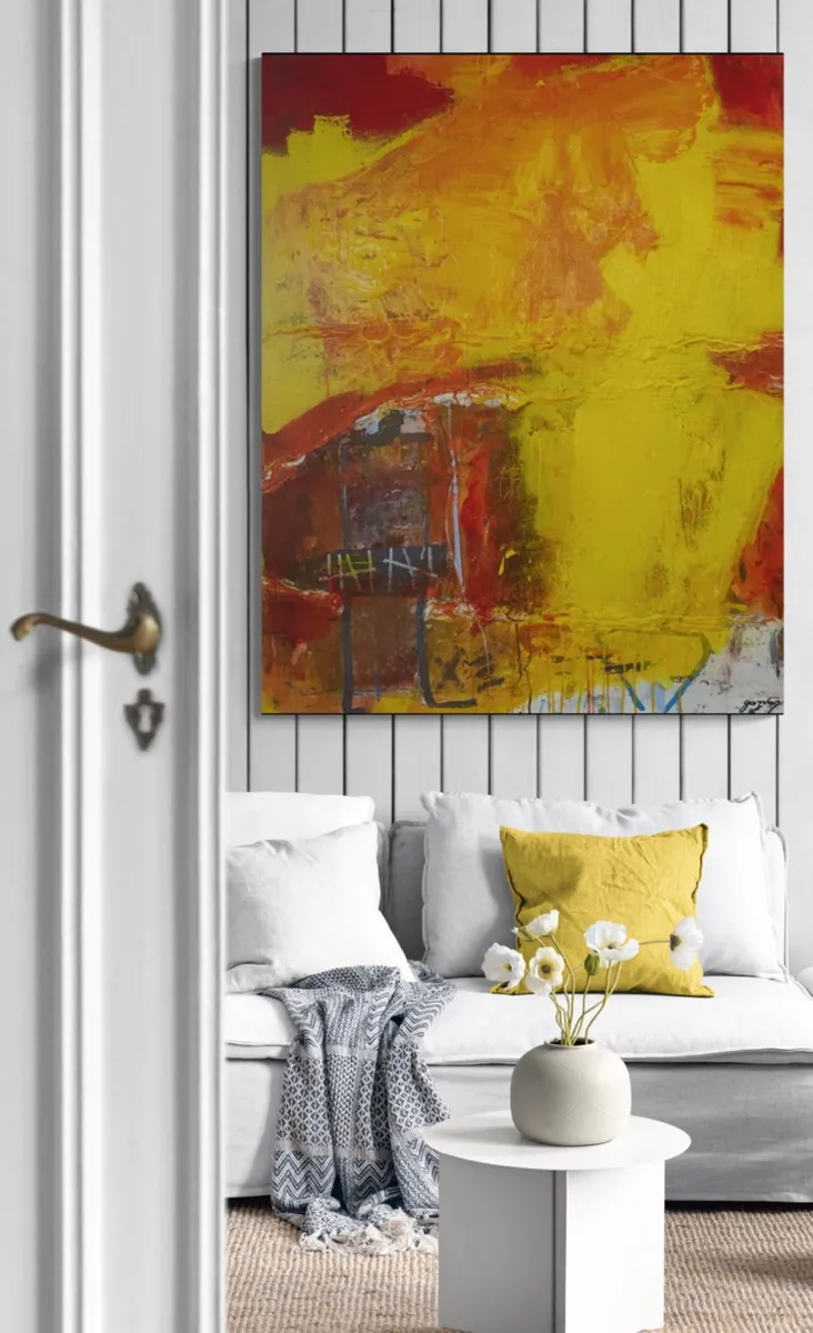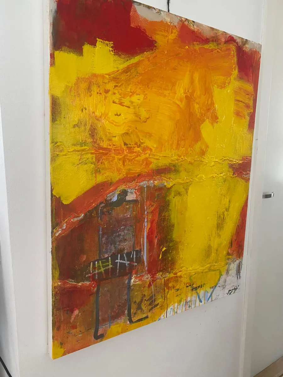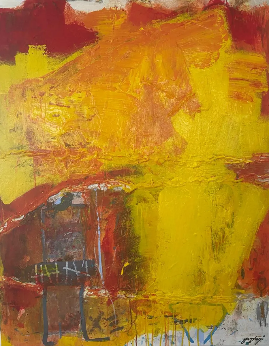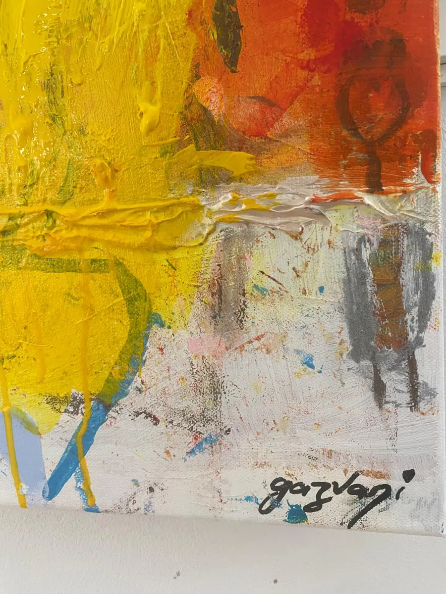 Energetic strokes and warm colors reflect the vibrancy and passion within human relationships. This painting draws its inspiration from the exciting and rhythmic energy created by mutual love and understanding, much like the beat of a heart.