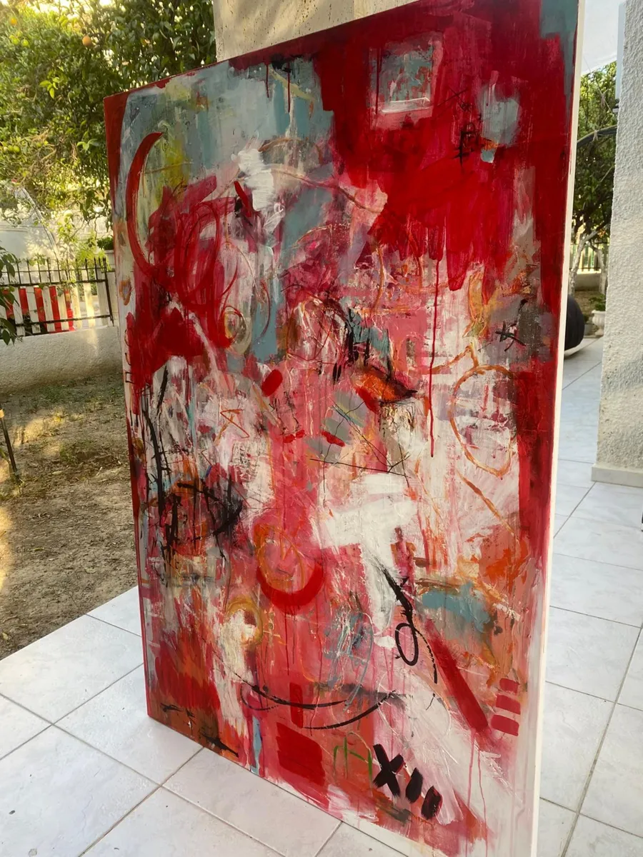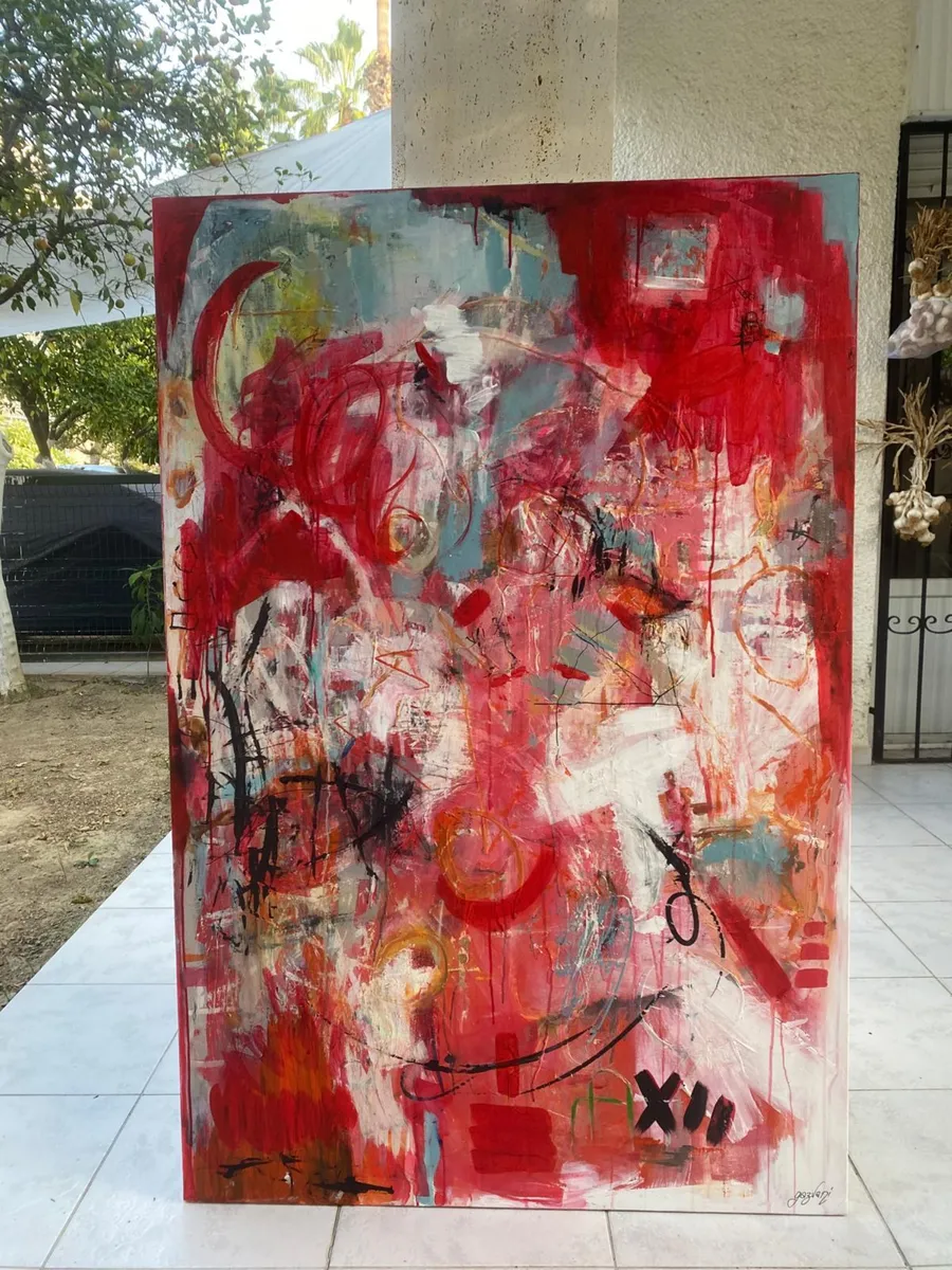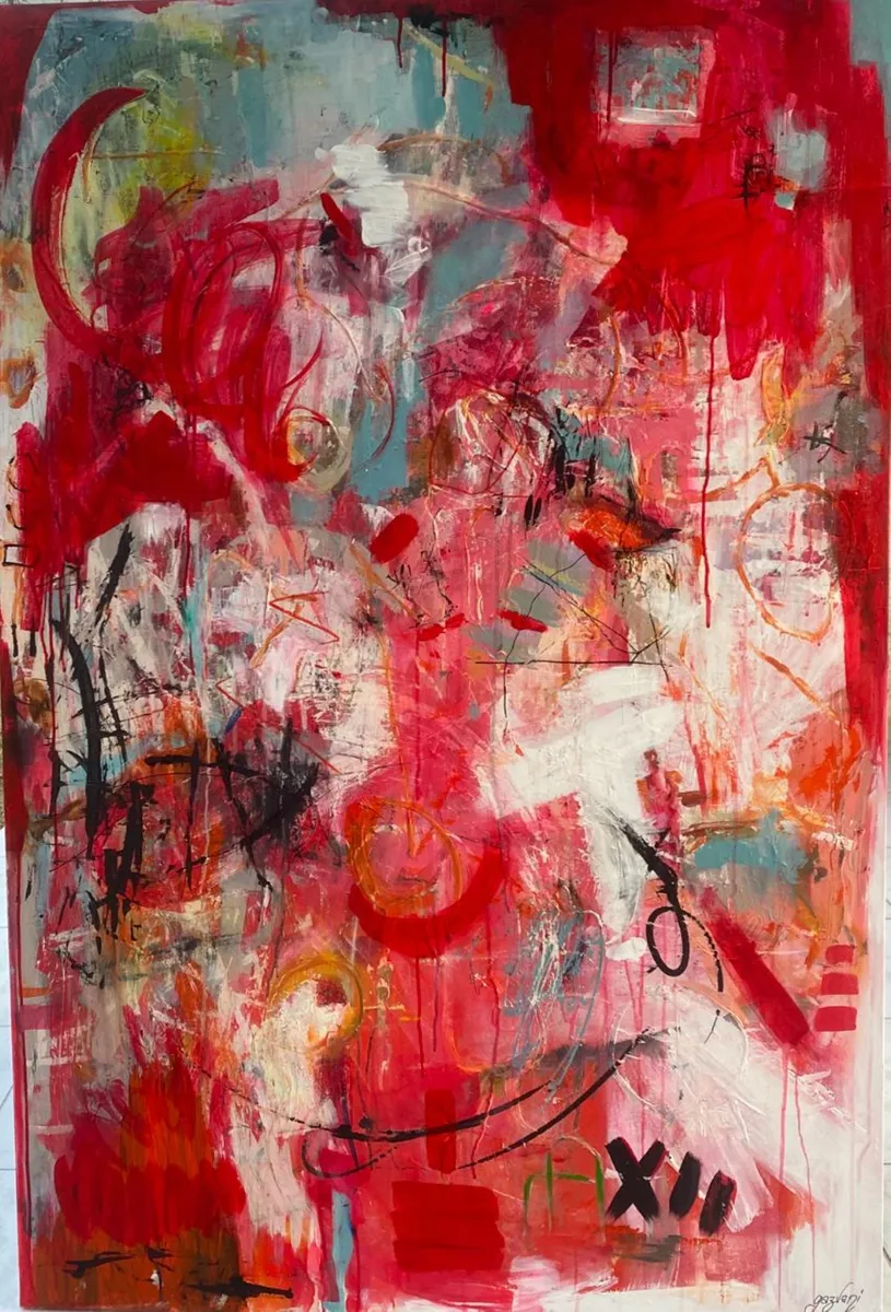 A Passionate Love To love somebody with deep feelings made me encouraged to visualise a profound and intense form of love characterized by deep emotional connection and fervent affection. This love often involves a strong desire and longing for the beloved, creating a sense of urgency and intensity in the relationship. It is marked by powerful emotions, including joy, excitement, and sometimes even pain, as the lovers navigate the highs and lows of their deep connection. It can be both exhilarating and overwhelming, as it pushes individuals to explore the depths of their emotions and the boundaries of their hearts. This kind of love is celebrated for its ability to make life feel more vibrant and meaningful, even as it challenges those who experience it to confront their vulnerabilities and desires.Overall, my painting conveys a dynamic, passionate, and intense feeling. Its abstract elements encourage viewers to interpret it personally, discovering new details each time.