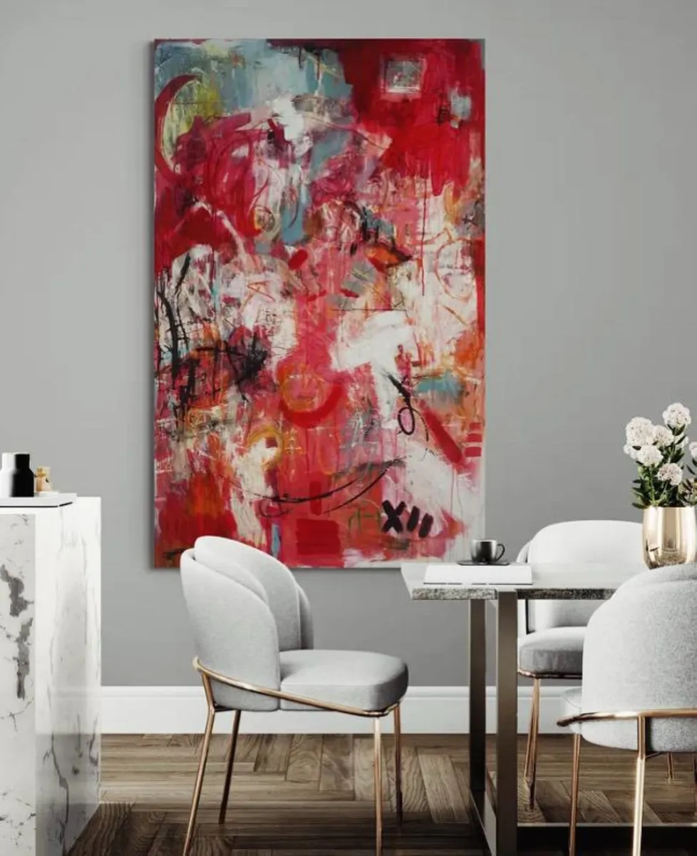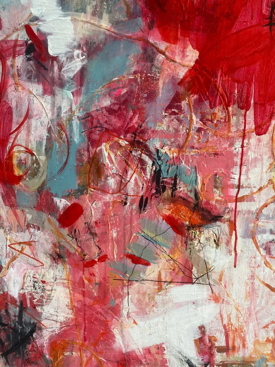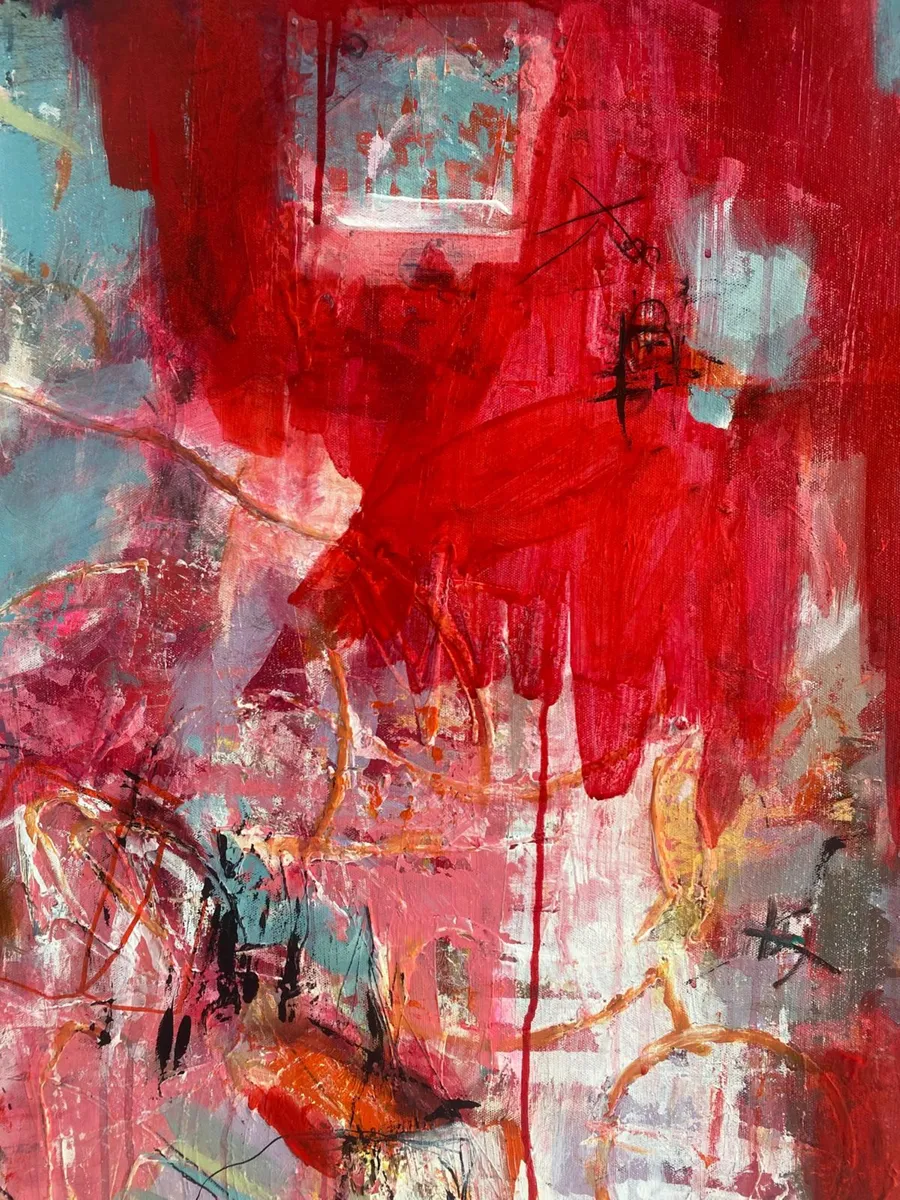 A Passionate Love To love somebody with deep feelings made me encouraged to visualise a profound and intense form of love characterized by deep emotional connection and fervent affection. This love often involves a strong desire and longing for the beloved, creating a sense of urgency and intensity in the relationship. It is marked by powerful emotions, including joy, excitement, and sometimes even pain, as the lovers navigate the highs and lows of their deep connection. It can be both exhilarating and overwhelming, as it pushes individuals to explore the depths of their emotions and the boundaries of their hearts. This kind of love is celebrated for its ability to make life feel more vibrant and meaningful, even as it challenges those who experience it to confront their vulnerabilities and desires.Overall, my painting conveys a dynamic, passionate, and intense feeling. Its abstract elements encourage viewers to interpret it personally, discovering new details each time.