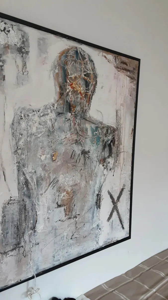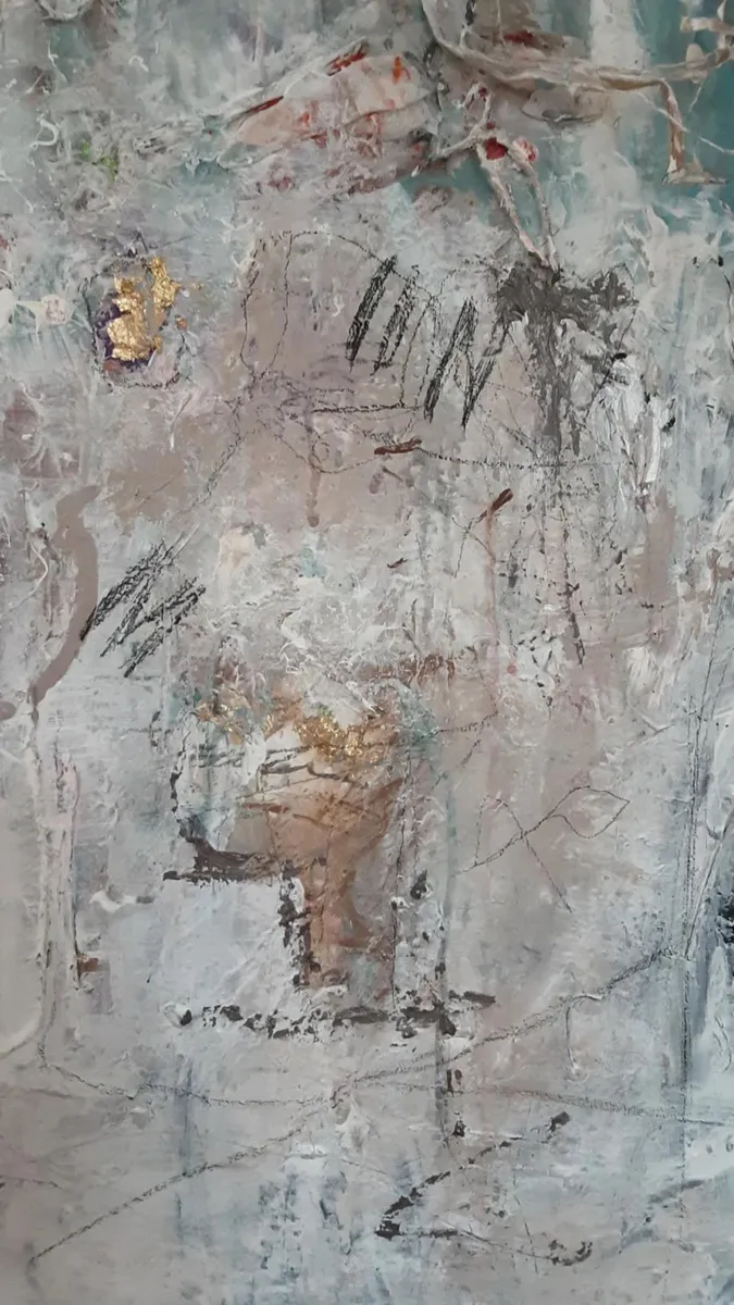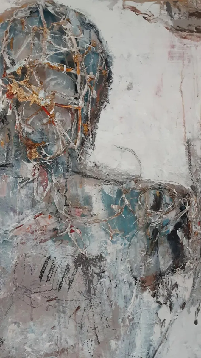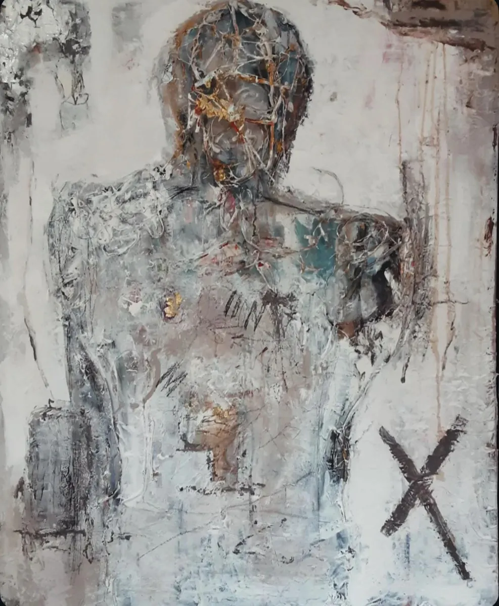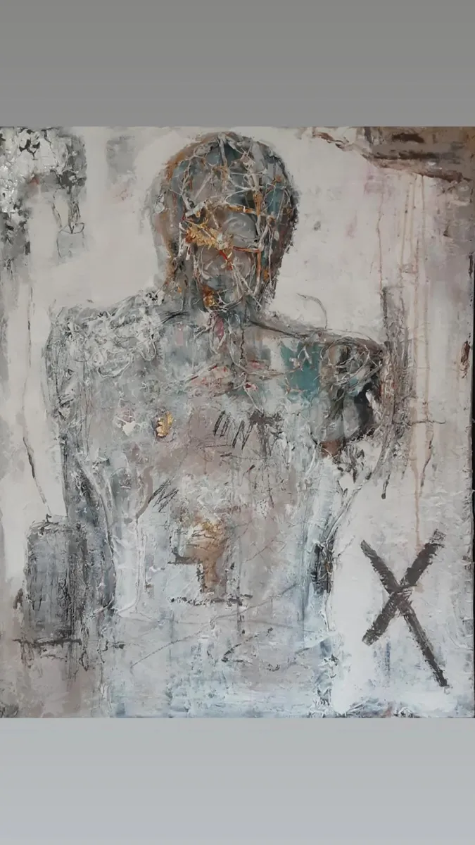 Self-Embrace... emerges from the courage to remain with oneself in moments of fragmentation. The body carries memory; the surface carries time. The gold does not attempt to hide the fractures — it follows them, honoring what has been endured. The work is inspired by the idea that healing is not erasure, but acceptance. It reflects the quiet strength found in presence — in choosing to stay with what feels broken rather than turning away. Not perfection, but honesty. Not restoration, but recognition. Acrylic Painting-Mixed Media